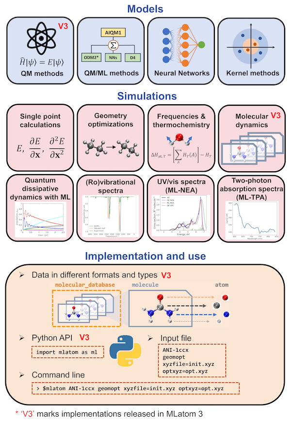 Text and figures of this overview are adapted from the paper on MLatom 3 in J. Chem. Theory Comput. 2024, DOI: 10.1021/acs.jctc.3c01203 (published under the CC-BY 4.0 license; see the original paper for more references and theory). More information about MLatom and its developers is on MLatom.com.