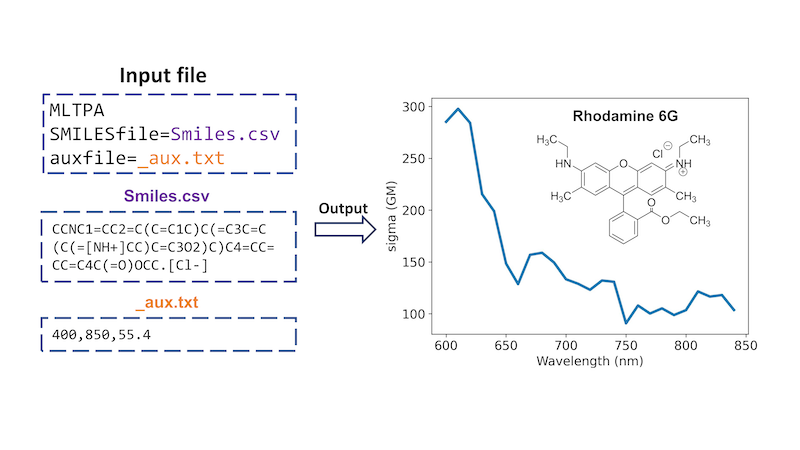 Beyond one-photon absorption, MLatom has an implementation of a unique ML approach for calculating two-photon absorption (TPA) cross sections of molecules just based on their SMILES strings, which are converted into the required descriptors using the interface to RDKit, and solvent information. This ML-TPA approach is very fast with accuracy comparable to that of much more computationally intensive QM methods. We provide an ML model pretrained on experimental data. ML-TPA was tested in real laboratory settings and was shown to provide a good estimate for new molecules not present in the training experimental database. An example of using ML-TPA to predict two-photon absorption (see manual):