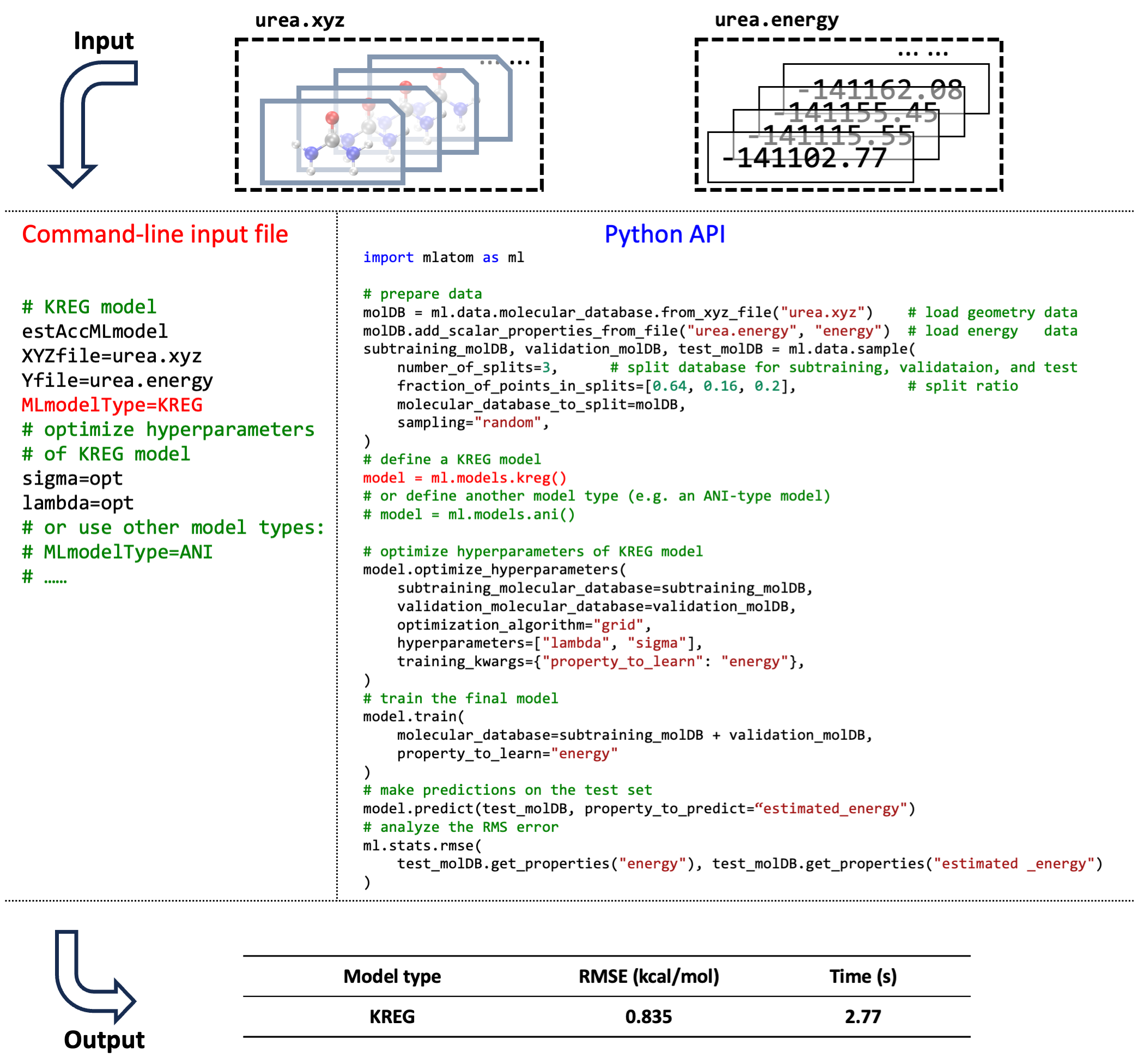 Side-by-side comparison of the usage of MLatom in both the command-line mode and via Python API for training and testing the KREG model on a 1000-point data set on the urea molecular PES data set randomly sampled from the WS22 database (see tutorial):