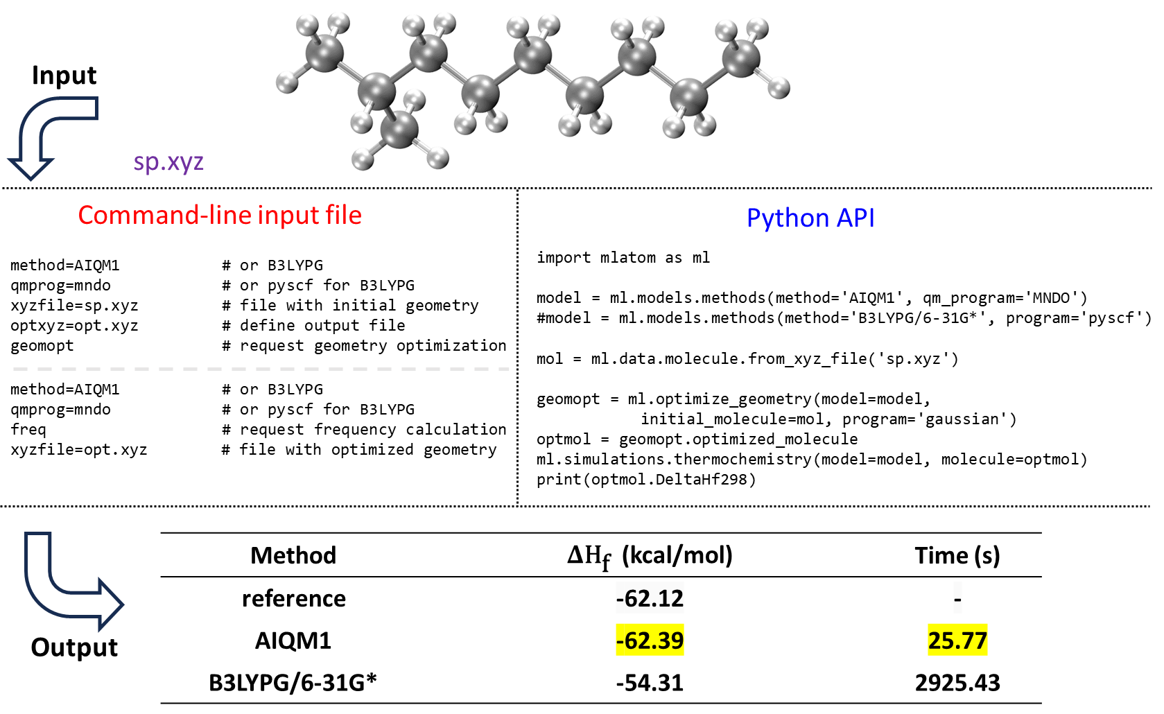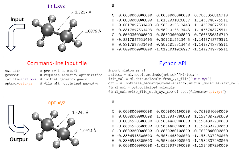 How the user interacts with the program is also important, and ideally, the features should be easily accessible and their use intuitive. MLatom calculations can be requested by providing command-line options either directly or through the input file. Alternatively, MLatom can be used as a Python module, which can be imported and used for creating calculation workflows of varying complexity. A side-by-side comparison of these two approaches is given in figure below for a common task of geometry optimization with one of the pretrained ML models ANI-1ccx: