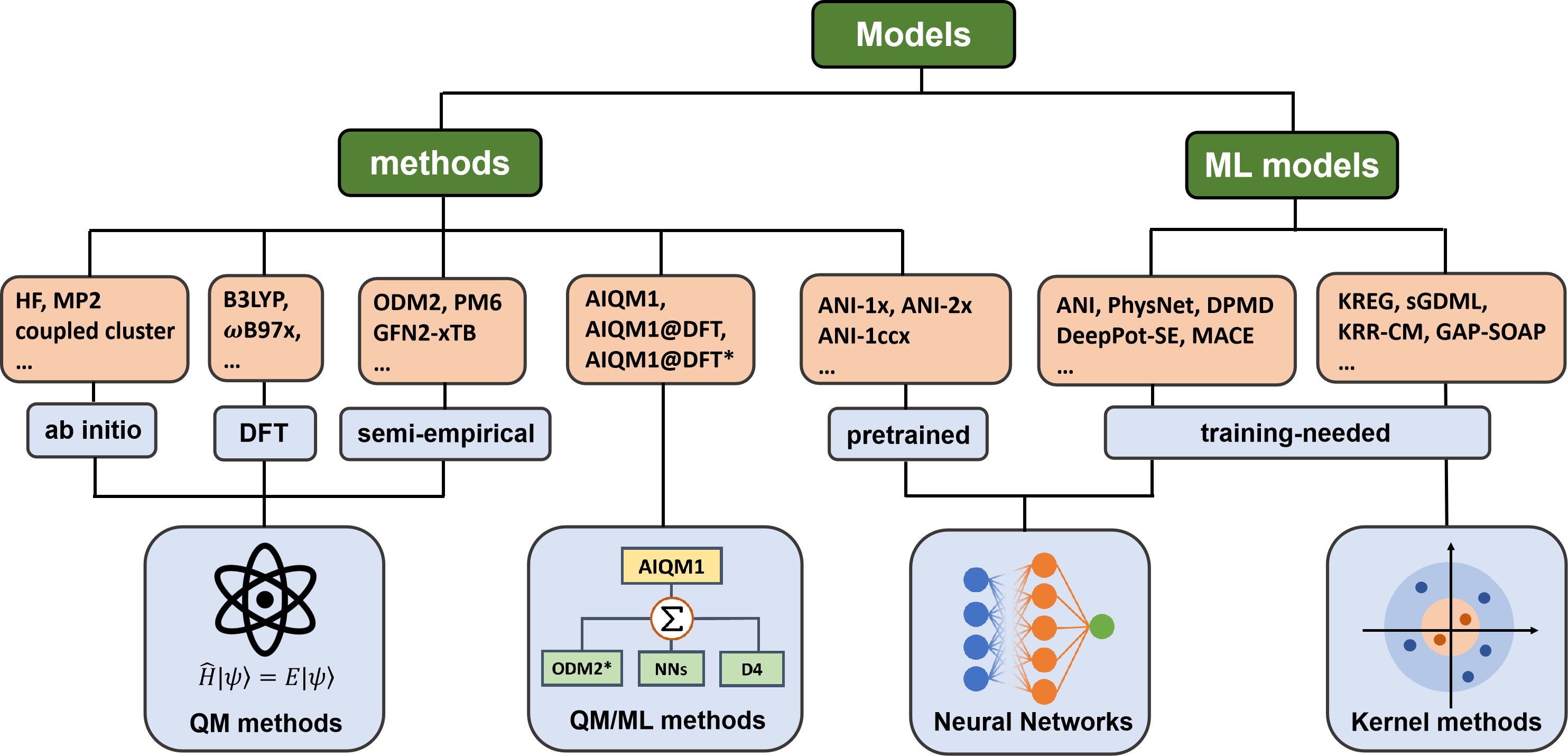 Any of the simulations need a model that provides the required output for a given input. The architecture and algorithms behind the models can be designed by an expert or chosen from the available selection. ML models typically require training to find their parameters before they can be used for simulations. Some of these models, such as universal MLPs of the ANI family, are already pretrained for the user who does not have to train them. This is similar to QM methods, which are commonly used out-of-the-box without tuning their parameters. In MLatom, we call a method any model that can be used out-of-the-box for simulations. Both pretrained ML models and QM methods belong to the methods in MLatom’s terminology, which is reflected in the keyword names. This model type also includes hybrid pretrained ML and QM methods. The overview of the models available in MLatom:
