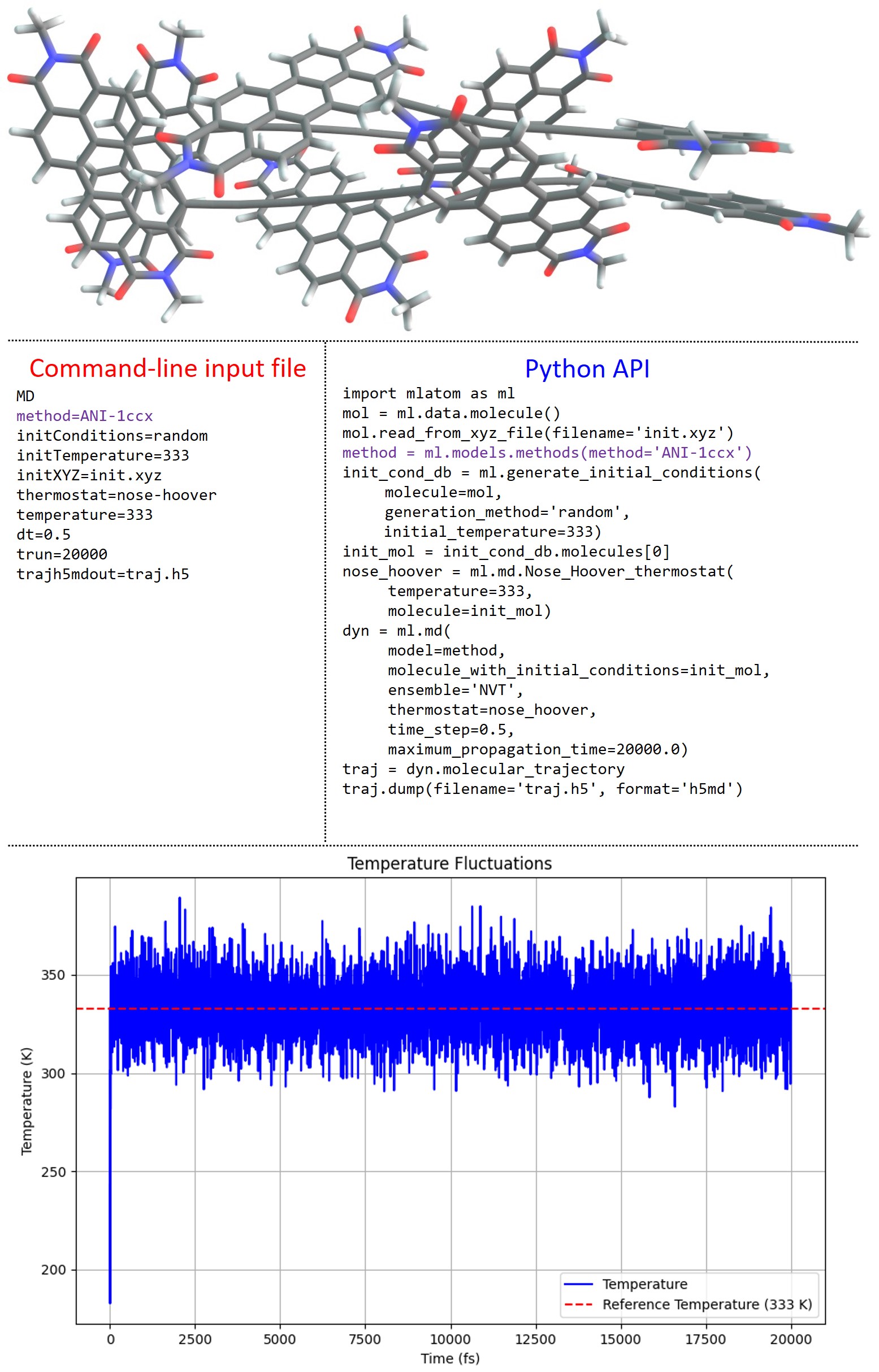 Currently, simulations in NVE and NVT ensembles, based on the velocity Verlet algorithm, are possible. NVT simulations can be carried out with the Andersen and Nosé–Hoover thermostats, and the implementation of other thermostats is expected to be available in the future. Trajectories can be saved in different formats, including plain text, JSON, and more compact H5MD database formats. In addition, we made an effort to better integrate the KREG model implemented in Fortran into the main Python-based MLatom code, which makes MD with KREG very efficient.