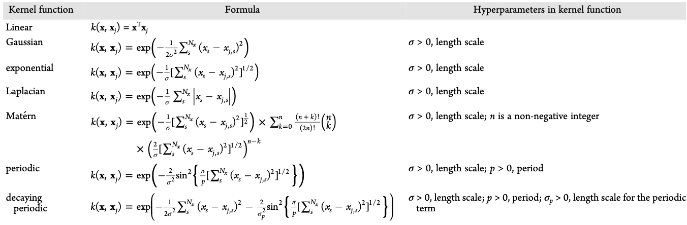 MLatom also provides the flexibility of training custom models based on kernel ridge regression (KRR) for a given set of input vectors x or XYZ coordinates and any labels y. If XYZ coordinates are provided, they can be transformed in one of the several supported descriptors (e.g., inverse internuclear distances and their version normalized relative to the equilibrium structure (RE) and the Coulomb matrix). The user can choose from one of the implemented kernel functions, including the linear, Gaussian, exponential, Laplacian, and Matérn as well as periodic and decaying periodic functions, which are summarized in Table 2. These kernel functions \(k(\mathbf{x},\mathbf{x}_j;\mathbf{h})\) are key components required to solve the KRR problem of finding the regression coefficients \(\alpha\) of the approximating function \(f(\mathbf{x};\mathbf{h})\) of the input vector \(\mathbf{x}\):