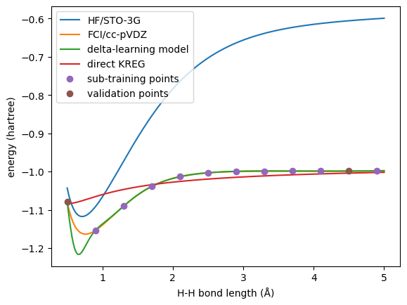 Here we show how to do delta-learning on a simple example of the potential energy curve (PEC) of the hydrogen molecule and we will use the KREG model to learn the correction from the HF/STO-3G to full CI (FCI/cc-pVDZ) level.