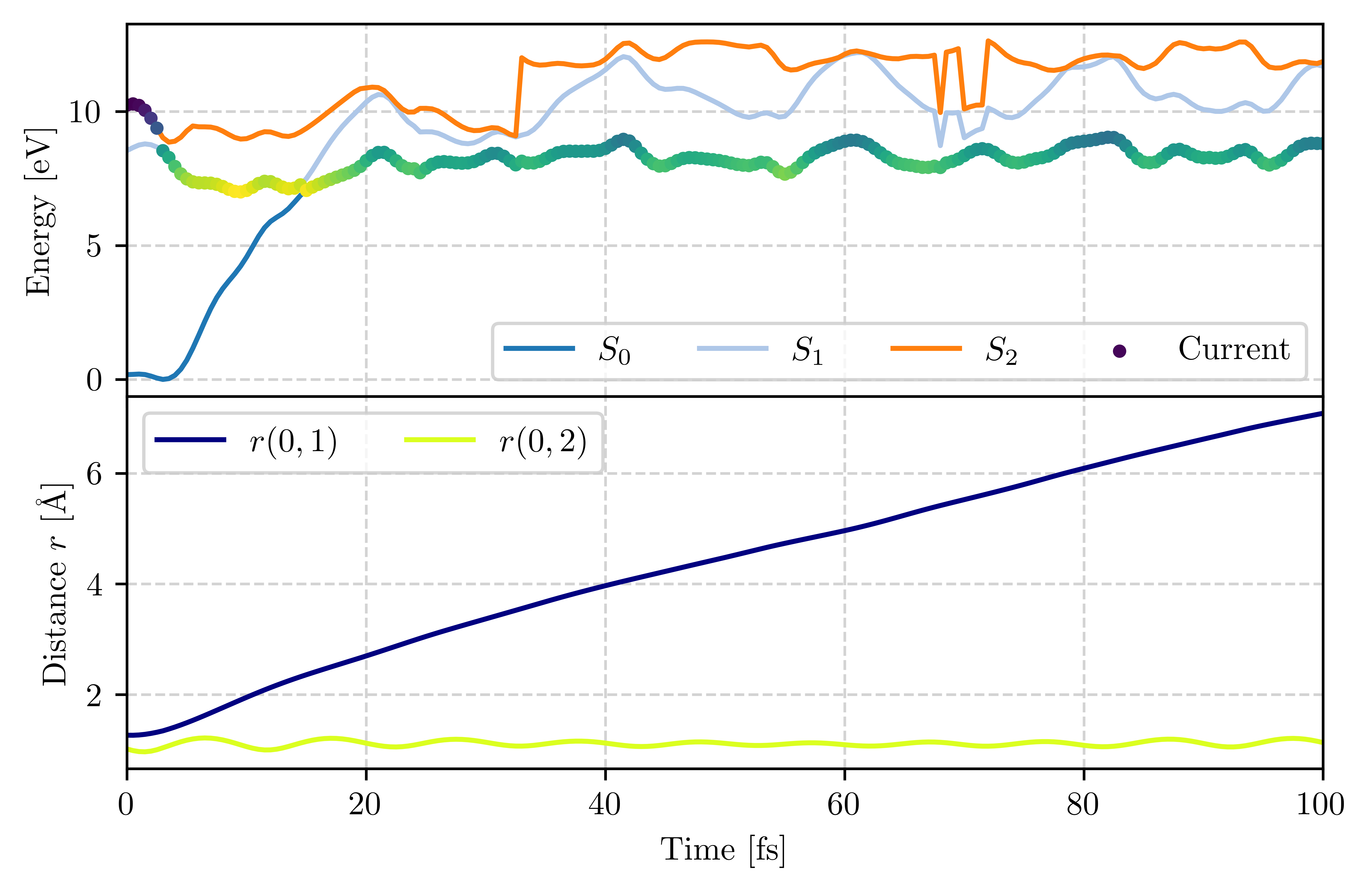 ml.namd.plot_trajs([traj], geom_params=[[0,1], [0,2]], show_tdc=False, only_energy_params=False, filename=None)