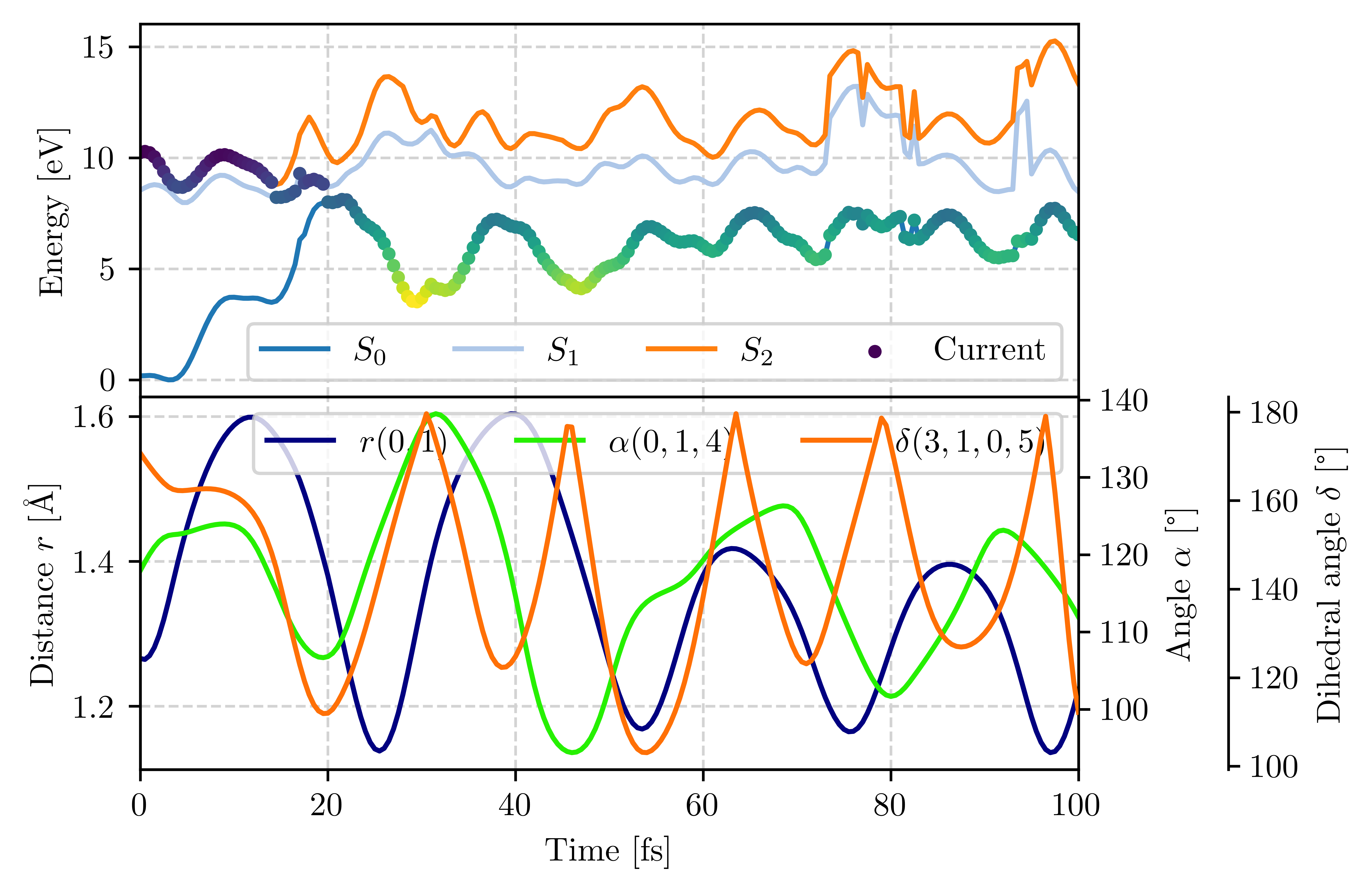 ml.namd.plot_trajs([traj], geom_params=[[0,1], [0,1,2]], show_tdc=False, only_energy_params=False, filename='analysis4_4')
