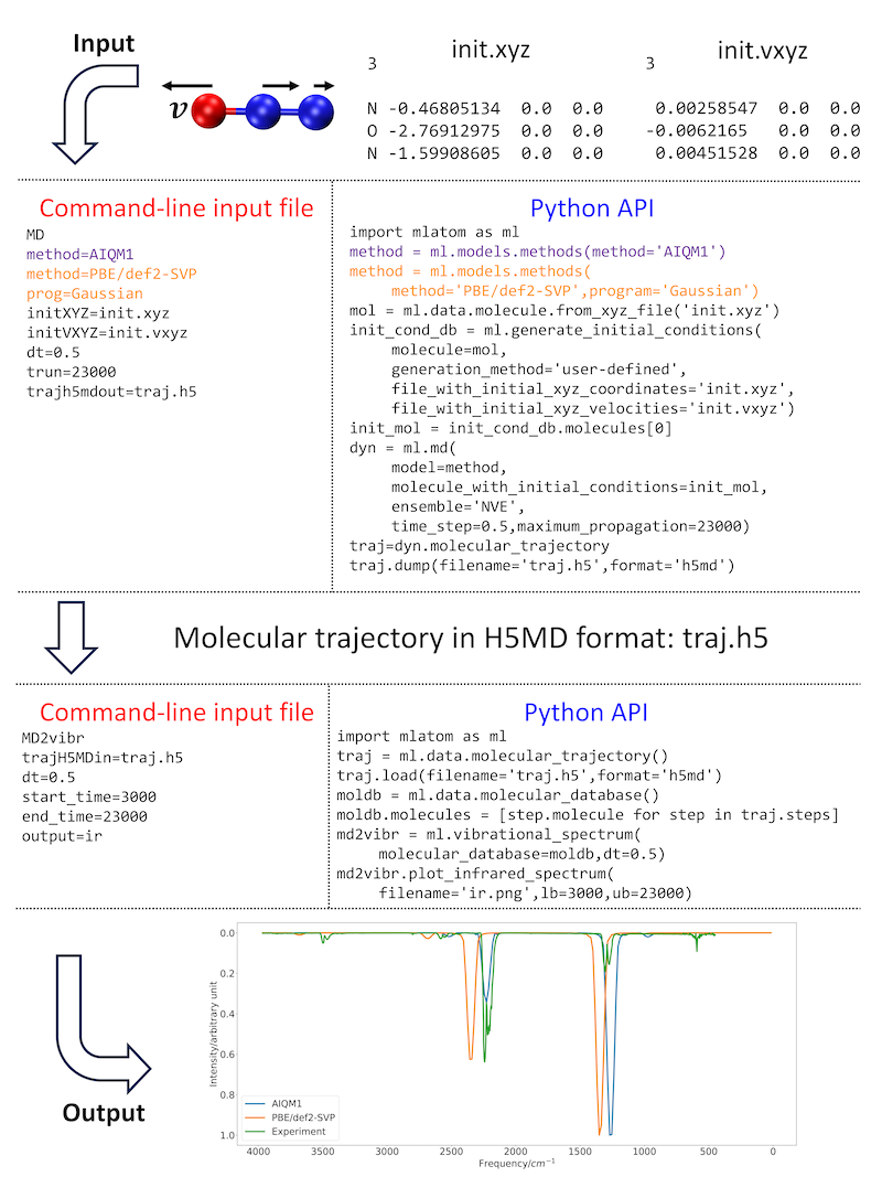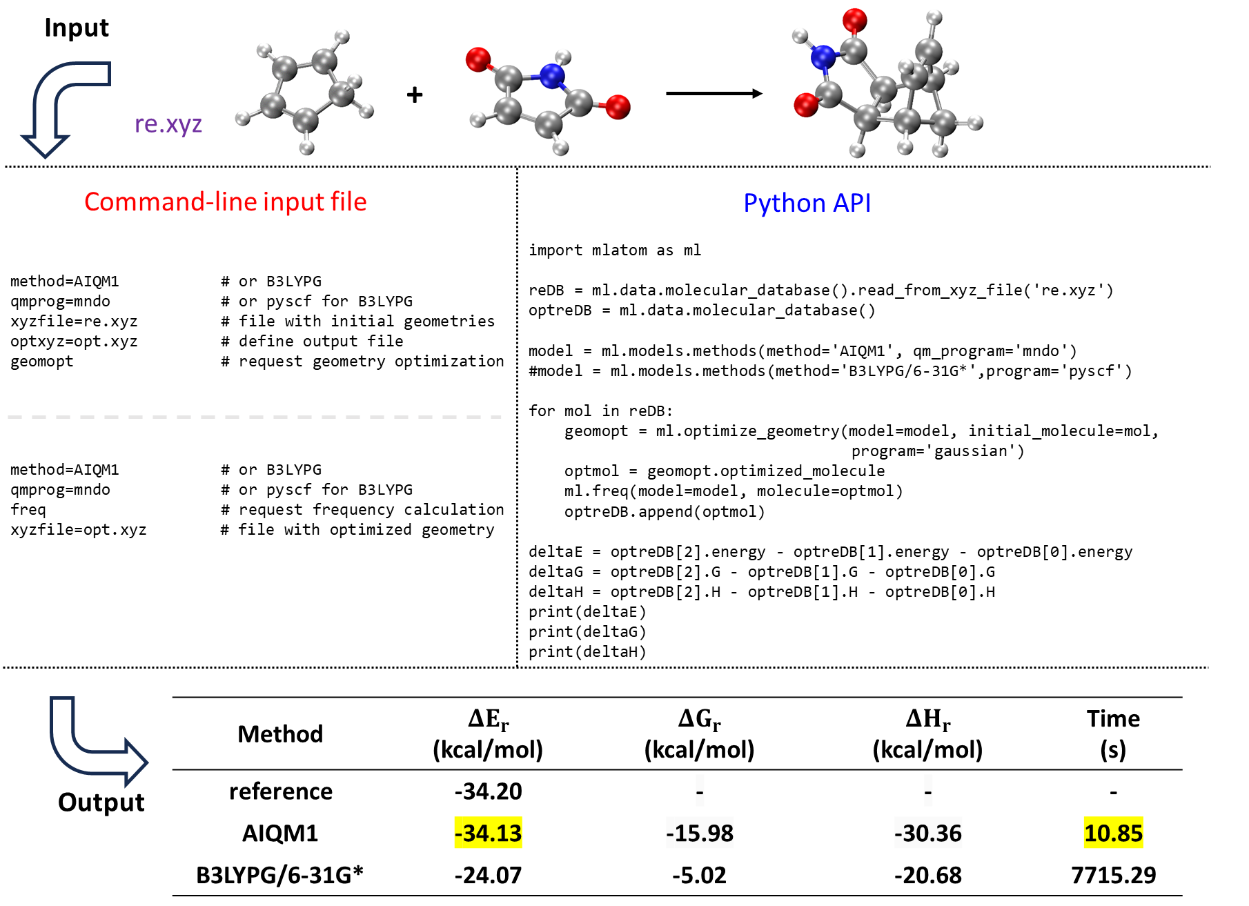 How the user interacts with the program is also important, and ideally, the features should be easily accessible and their use intuitive. MLatom calculations can be requested by providing command-line options either directly or through the input file. Alternatively, MLatom can be used as a Python module, which can be imported and used for creating calculation workflows of varying complexity. A side-by-side comparison of these two approaches is given in figure below for a common task of geometry optimization with one of the pretrained ML models ANI-1ccx: