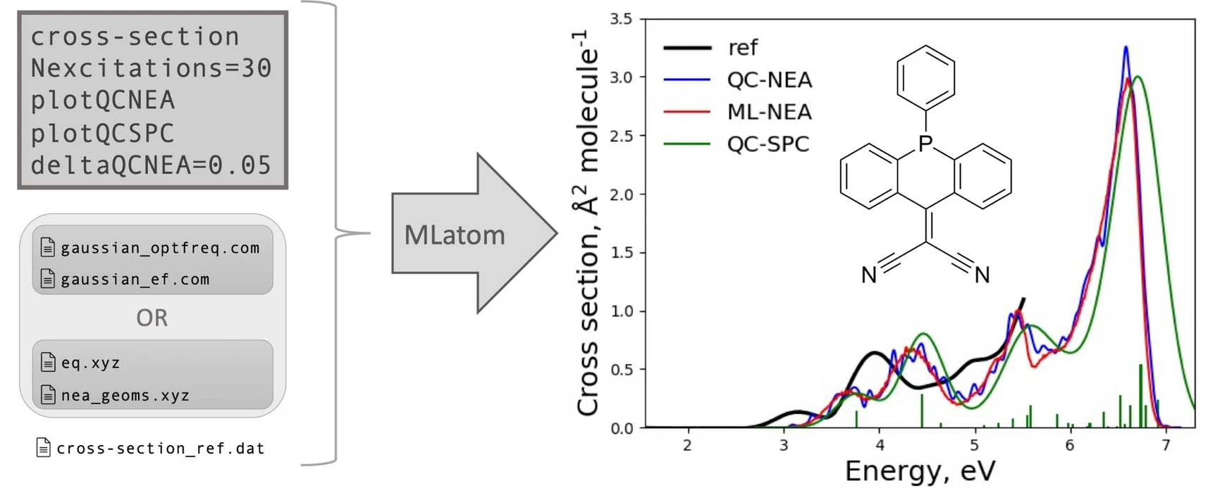 UV/vis absorption spectra simulations are computationally intensive because they require calculation of excited-state properties. In addition, better-quality spectra can be obtained via the nuclear ensemble approach (NEA), which necessitates the calculation of excited-state properties for thousands of geometries for high precision. MLatom implements an interpolation ML-NEA scheme that improves the precision of the spectra with a fraction of the computational cost of traditional NEA simulations (see tutorial):