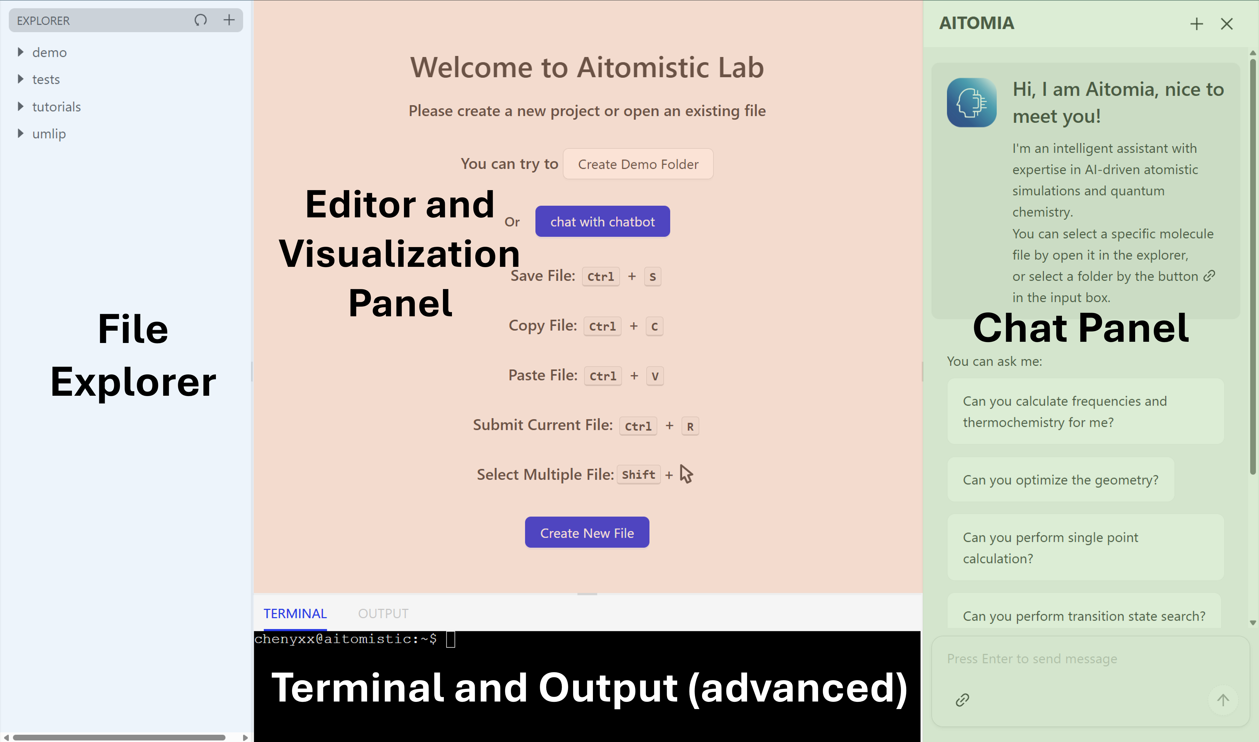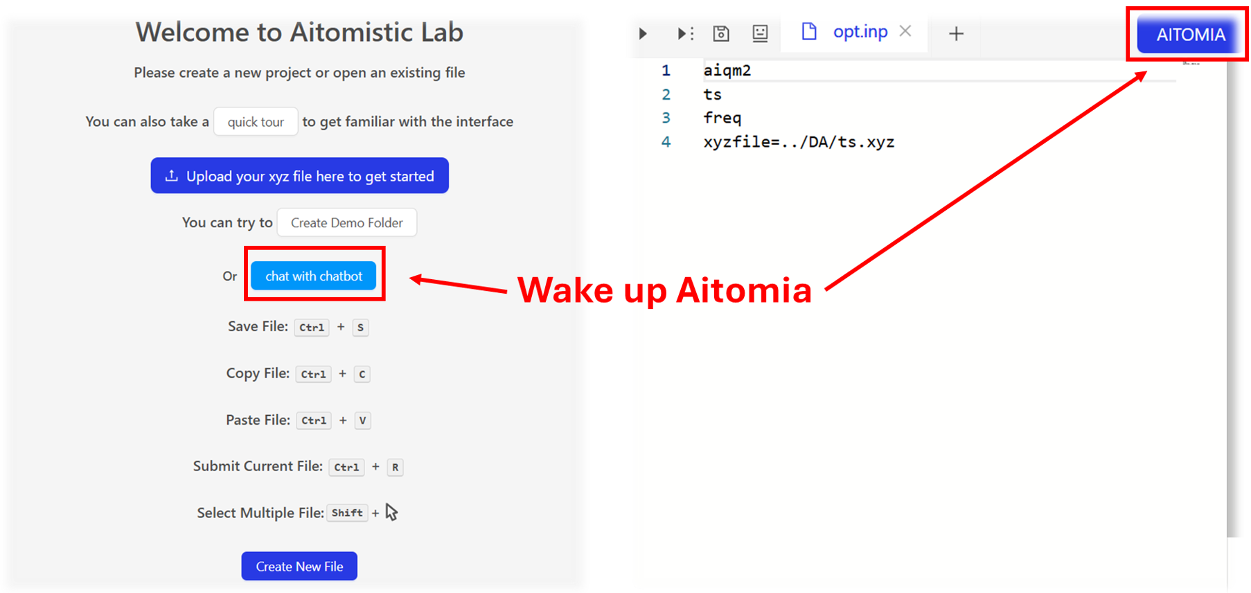The Chat panel with our intelligent assistant Aitomia can be waken up by clicking chat with chatbot on the welcome page or the AITOMIA on the upper right corner. We will also show later the fully autonomous derivation of the reaction properties by Aitomia.