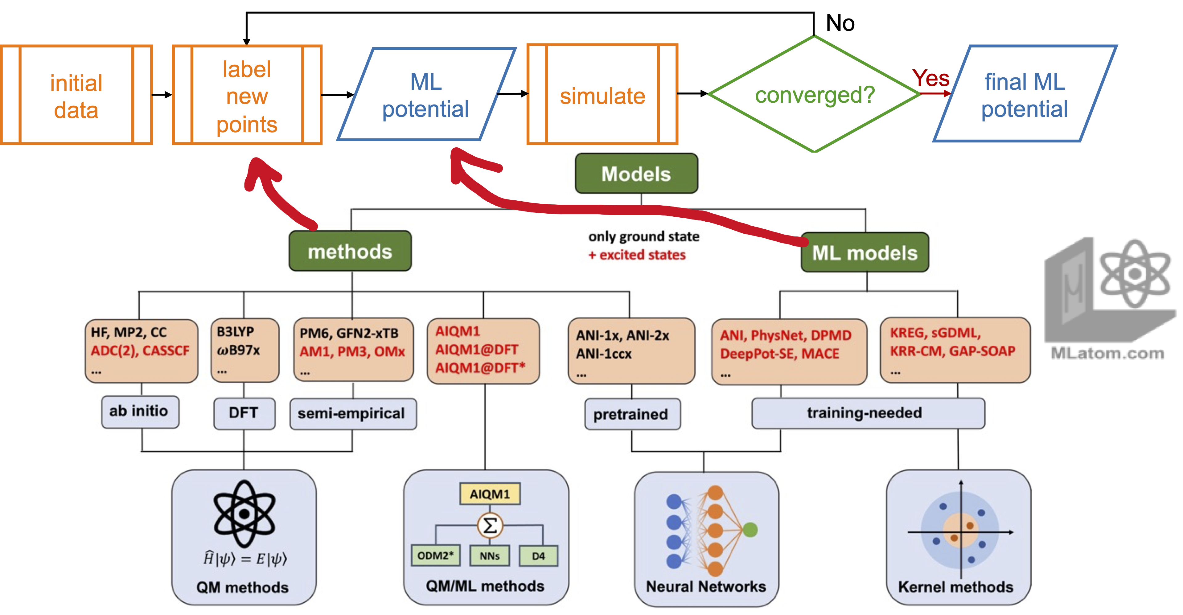 Active learning (AL) allows you to collect the data and build ML models required for your application from scratch. In MLatom we provide our physics-informed active learning for efficient building robust ML potentials (MLPs) for molecular dynamics (MD) applications. You can use this procedure with a variety of different MLPs (currently, KREG, ANI, and MACE are supported) and train them on the variety of different QM (DFT, ab initio, …) and even universal ML methods: