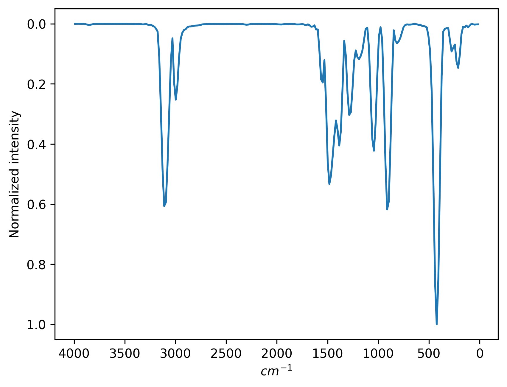 The keywords are slightly different from that in the input file. The user can use lb and ub to control the start time and end time of the trajectory. autocorrelation_depth and zero_padding can be used to tune the autocorrelation depth and zero padding. Normalization to the maximum intensity is enabled if normalize=True. The user can get frequencies and intensities from the return value of the function by using return_spectrum=True. In infrared specturm, the user can either use the modulus or XYZ vector of dipole moments by using format='modulus' or format='vector'.