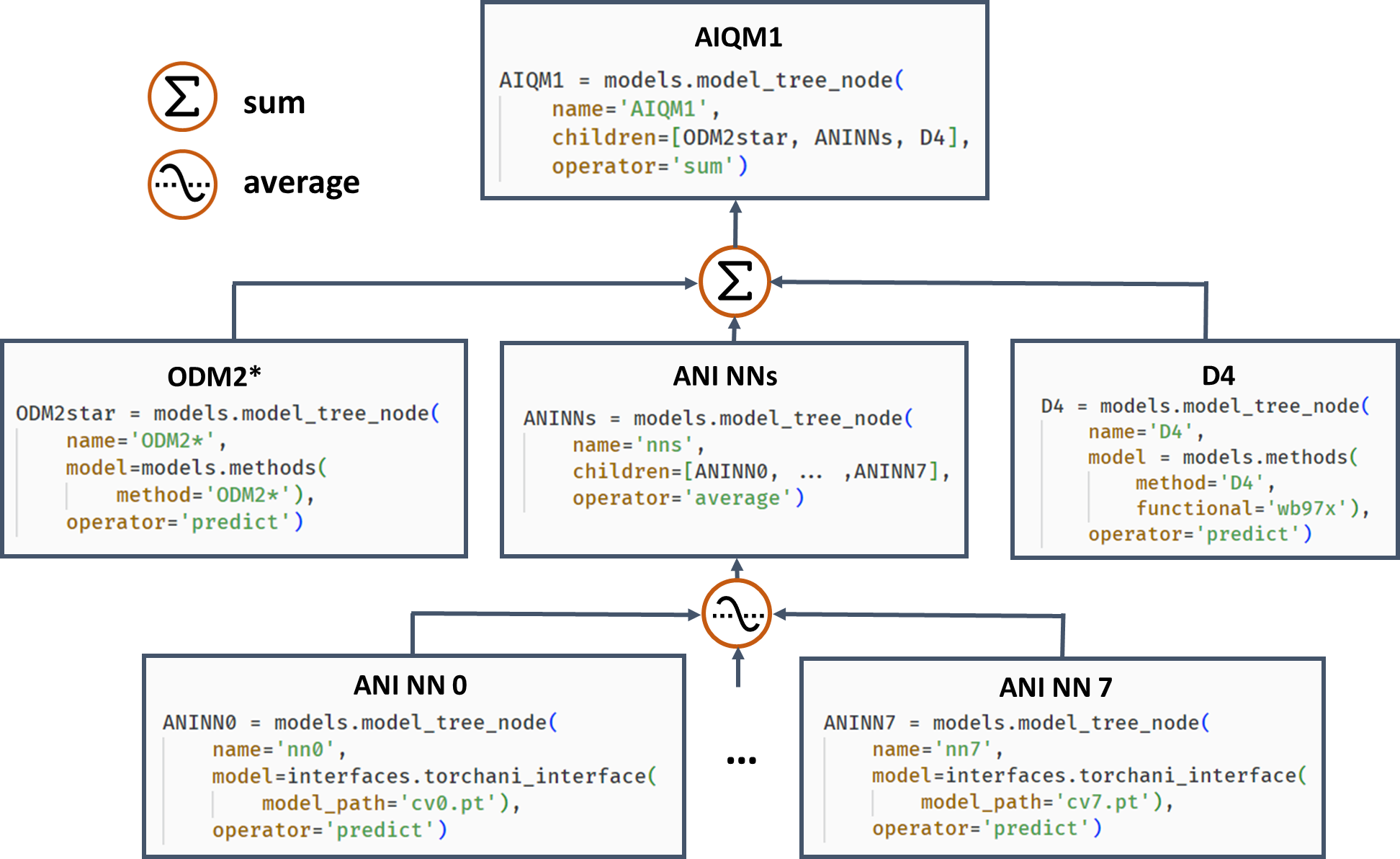AIQM1’s root parent node comprises three children, the semiempirical QM method ODM2*, the NN ensemble, and additional D4 dispersion correction. The NN ensemble in turn is a parent of eight ANI-type NN children. Predictions of parents are obtained by applying an operation “average” or “sum” to children’s predictions. The code snippets are shown, too.